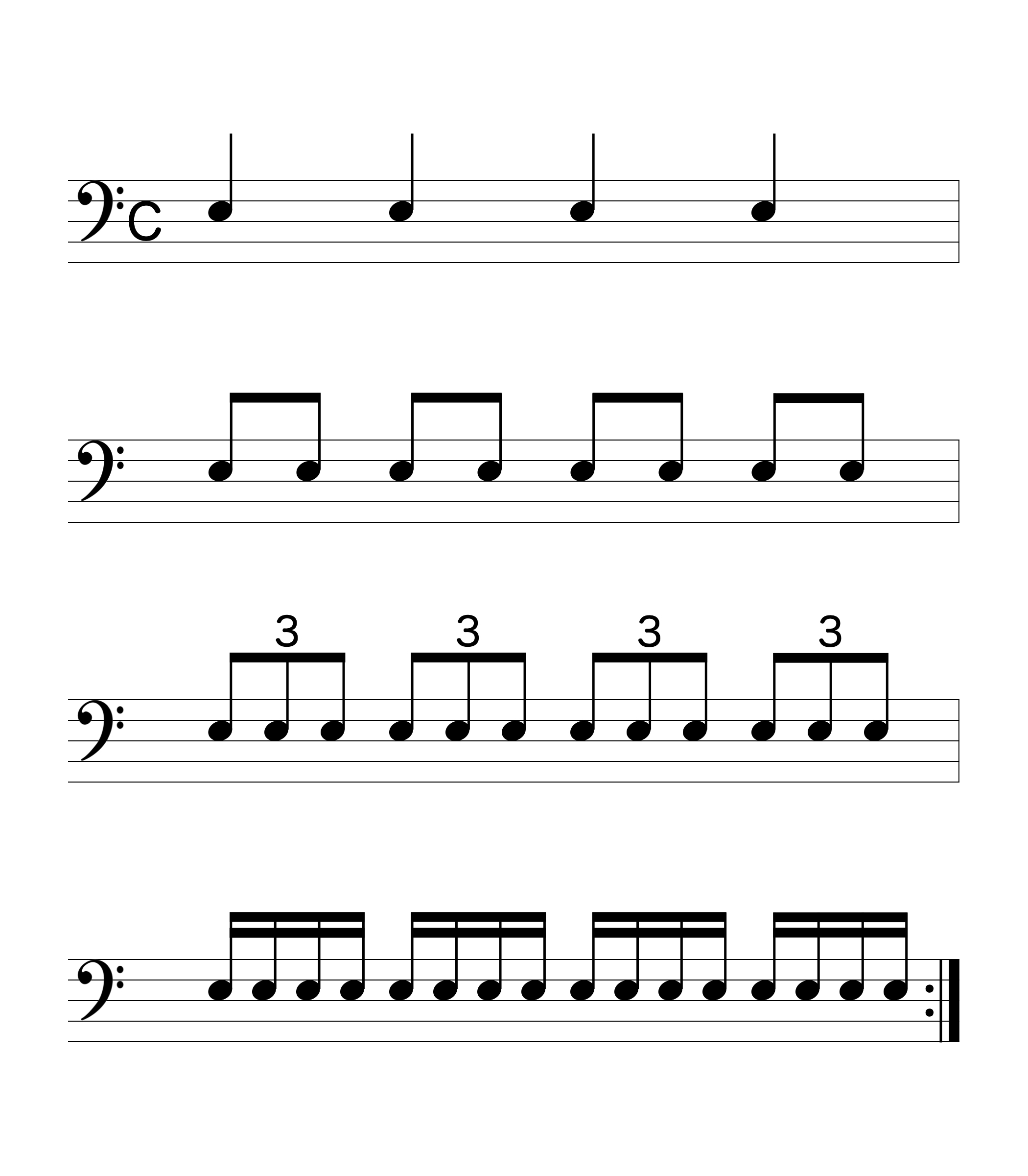 また、拍の分割(サブディビジョン)を意識することにもなるので、速いフレーズや細かい音符を演奏しても4分音符のパルス(拍)を見失わないよう、リズムの土台を築く訓練にもなります。サブディビジョンの理解は、様々なリズムパターンを演奏したり他の楽器とアンサンブルをする上でもとても大切になります。