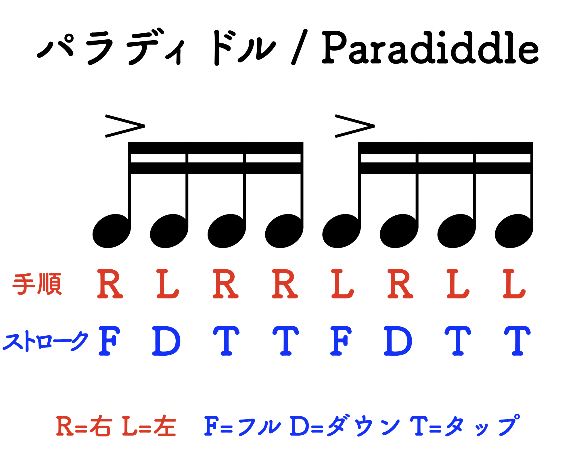 一番ノーマルなもの(シングルパラディドル)は、『右左右右・左右左左』という手順で進み、それぞれの頭にアクセントが付いた形になります。